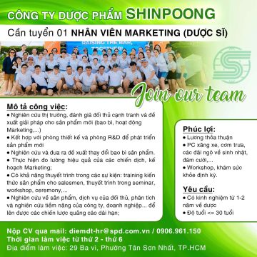 Tuyển dụng Nhân viên Marketing (Dược sĩ) – Làm việc tại Shinpoong Pharma 1. Giới thiệu về Shinpoong Pharma Công ty Dược phẩm Shinpoong (100% vốn Hàn Quốc) có hơn 60 năm kinh nghiệm toàn cầu và 28 năm phát triển tại...